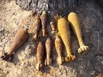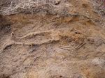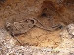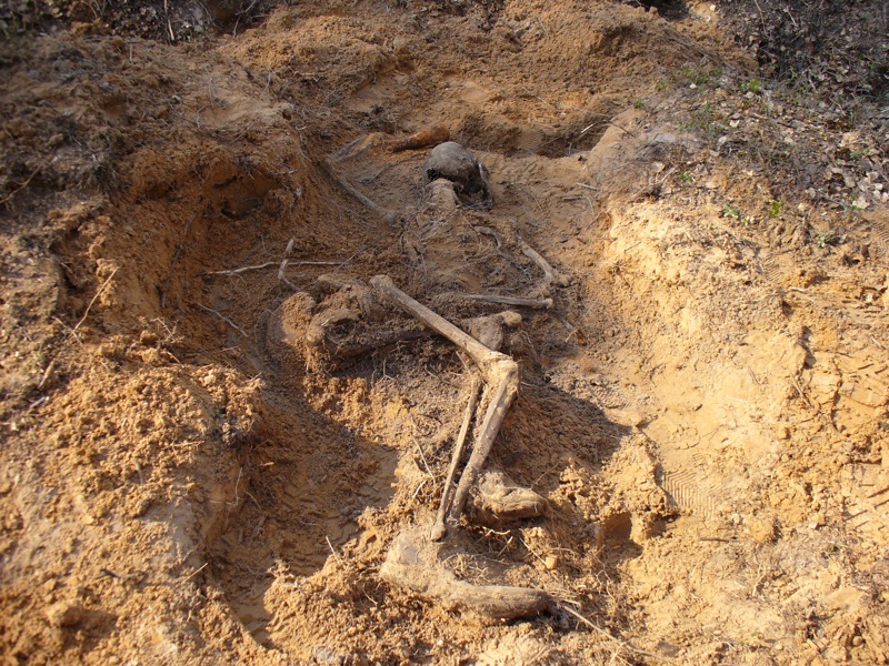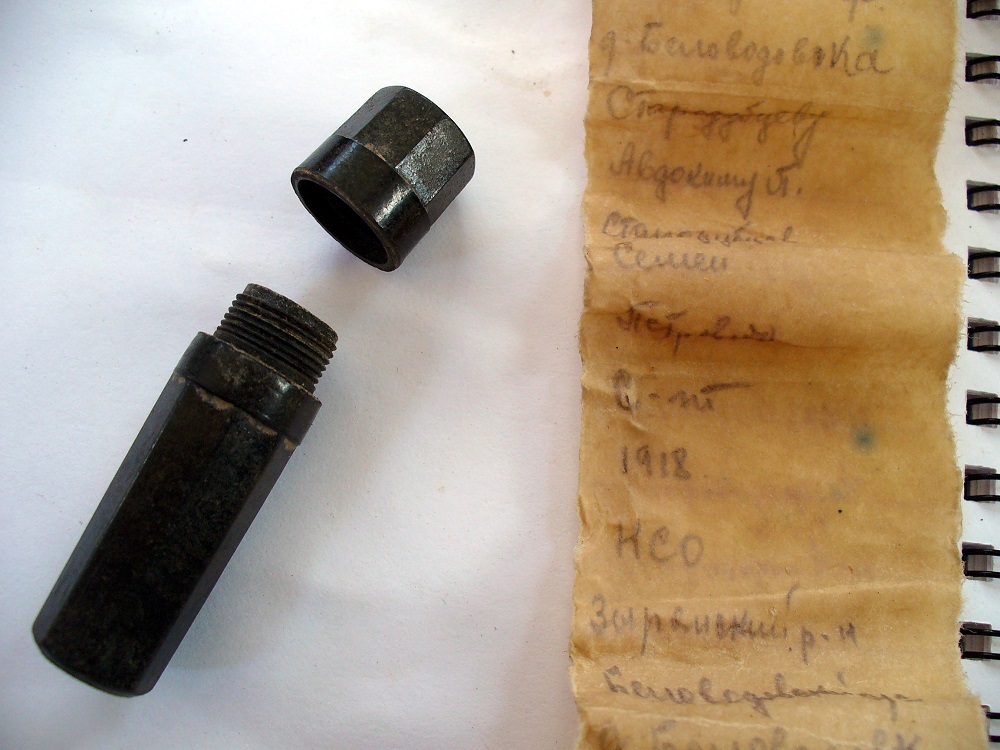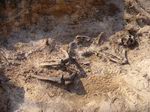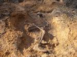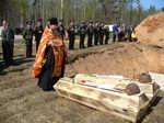 При помощи металлоискателей и щупов поисковая группа начала обследовать высоту. Было обнаружено множество следов войны - осколков, патронов, фрагментов обуви, снаряжения, была найдена неразорвавшаяся мина. Надежда обнаружить останки солдата была очень слабой, т.к. выота тщательно изучена поисковыми группами. Однако на бруствере одного из окопов Ю.П.Сычев обнаружил под слоем земли разбитую солдатскую флягу (из голубого стекла), а при детальном изучении окопа были найдены фрагменты черепа погибшего бойца. Постепенно зачищая обозначенный квадрат, поисковики извлекли из земли останки солдата (на верхнем снимке). К сожалению, кроме обойм патронов и обуви никаких личных вещей и медальона обнаружено не было. Но день прошел не напрасно - еще один русский солдат будет с почестями захоронен в братской могиле. А душа его, как утверждают поисковики, наконец-то обретет долгожданный покой.
