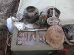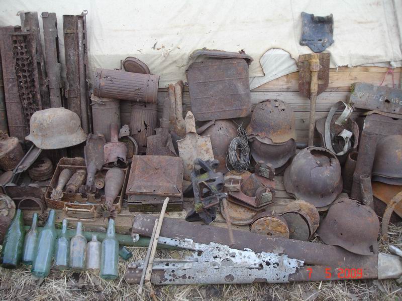 В лагере отряда, расположенном в районе д.Новая деревня, мы ознакомились с результатами работы по исковиков, они к 4 мая подняли из земли останки 35 бойцов, множество предметов вооружения и быта солдат. На месте боев найдены винтовки, патроны, гильзы, мины, щиток для продвижения солдат штурмового подразделения, фрагмент шасси немецкого самолета, ампуломет для разбрасывания отравляющих веществ, инструменты (армейская ножовка, кирка, фрагмент носилок), кружки, чайники, изготовленные Ленинградским металлическим заводом, и даже переносная печь с надписью «Завод им. Кагановича, 1938 г.». Подробно о каждой обнаруженном предмете еам рассказал командир отряда «Память» И.М.Неофитов.