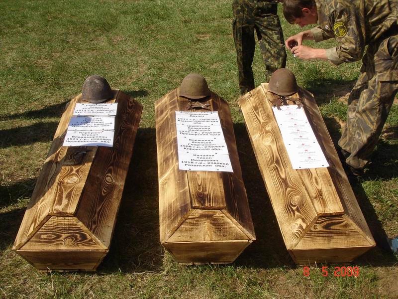 В первые дни поиска нам повезло: нашли останки семерых солдат и смертный медальон, который был поднят командиром отряда – И.М.Неофитовым, открыт и прочитан в лагере. Погибшим оказался Изенов Иван Николаевич. Это обстоятельство воодушевило на поиск всех членов отряда, особенно новичков. Мы в буквальном смысле слова врывались в землю, вгрызались в корни деревьев, в старые траншеи и окопы, ячейки и воронки, и поднимали и поднимали одного за одним погибших солдат. Вокруг нас, как водиться в таких местах, на небольшом пятачке были раскиданы груды искореженного металла, каски, ботинки, ремни, котелки, кружки, гильзы, осколки и еще много, много ржавых свидетельств той войны. К 1 мая уже были подняты останки 24 солдат РККА.