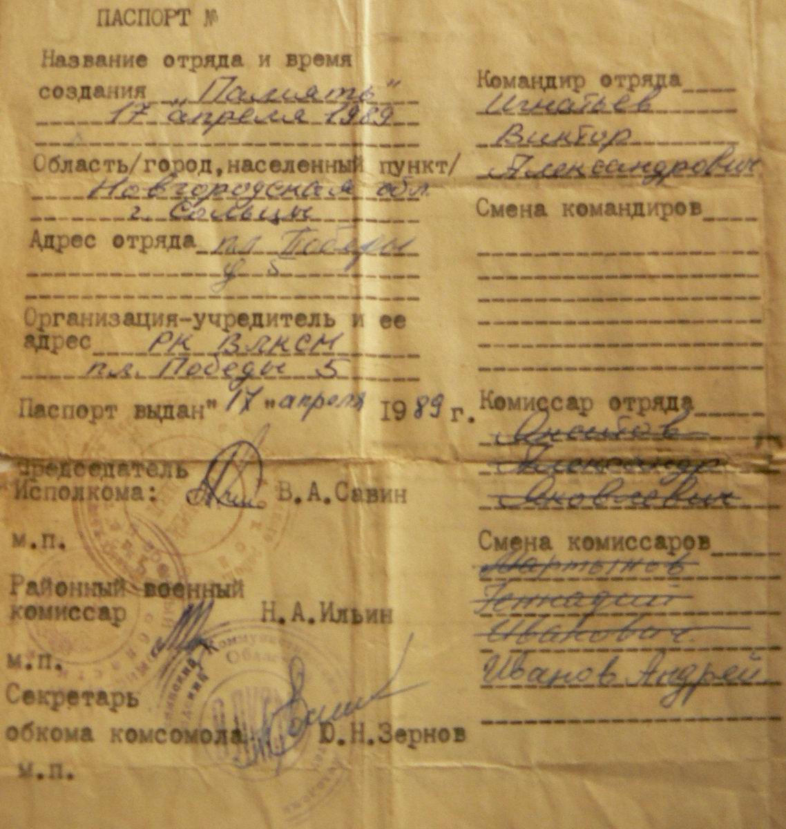Это и послужило предпосылкой рождения в апреле 1968 г. поискового движения, когда на базе Новгородского химкомбината был организован отряд "Сокол", основателем которого стал Николай Иванович Орлов. В феврале 1988 г. была создана Новгородская областная общественная организация "Поисковая экспедиция "Долина" памяти Н.И.Орлова". А 15 марта 1990 г. в её составе был образован поисковый отряд "Память" г.Сольцы (фактически "паспорт" отряда был получен годом раньше - 17 апреля 1989 г.). Первым командиром отряда был Виктор Александрович Игнатьев.