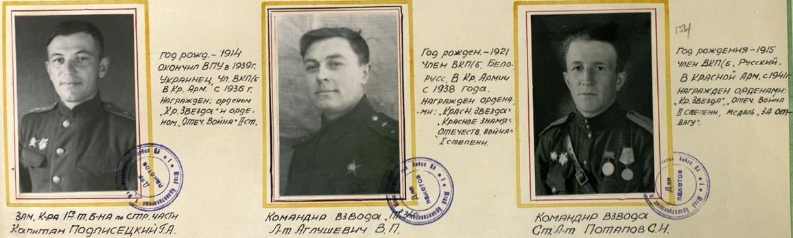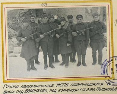 - Командир роты МСПБ ст. л-т Потапов. С группой бойцов из 4 человек он пошёл под Сольцы в разведку, где наткнулся на немецкую засаду, с которой вступил в бой. Разведчики отстреливались до тех пор, пока хватило патрон. Когда патроны кончились, тов. Потапов повёл их в рукопашный бой. Немцев было 20 человек. Они были рассеяны, в результате схватки разведчики захватили «языка».